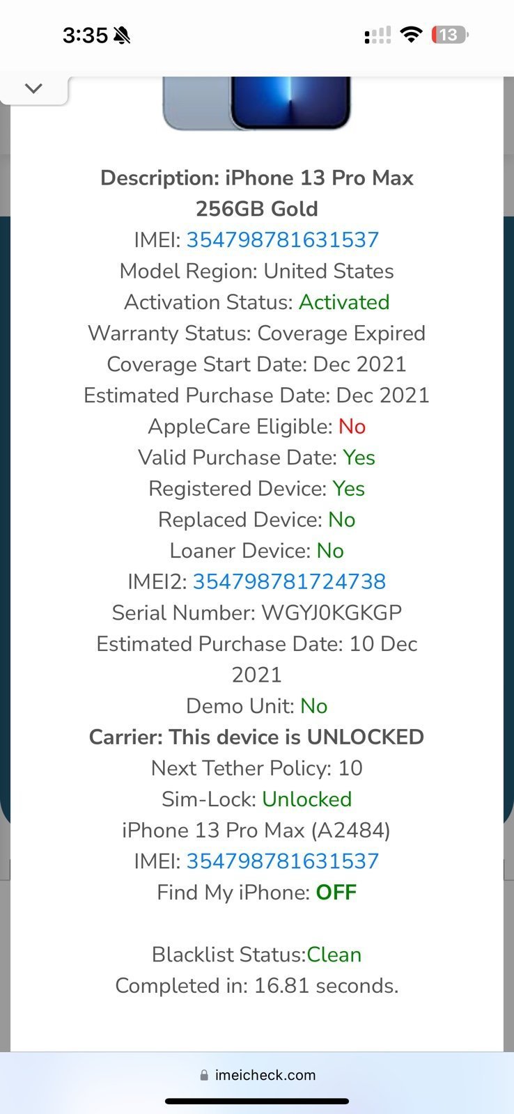 iPhone 13 Pro Max 256GB Gold UNLOCKED CLEAN IMEI 7K98